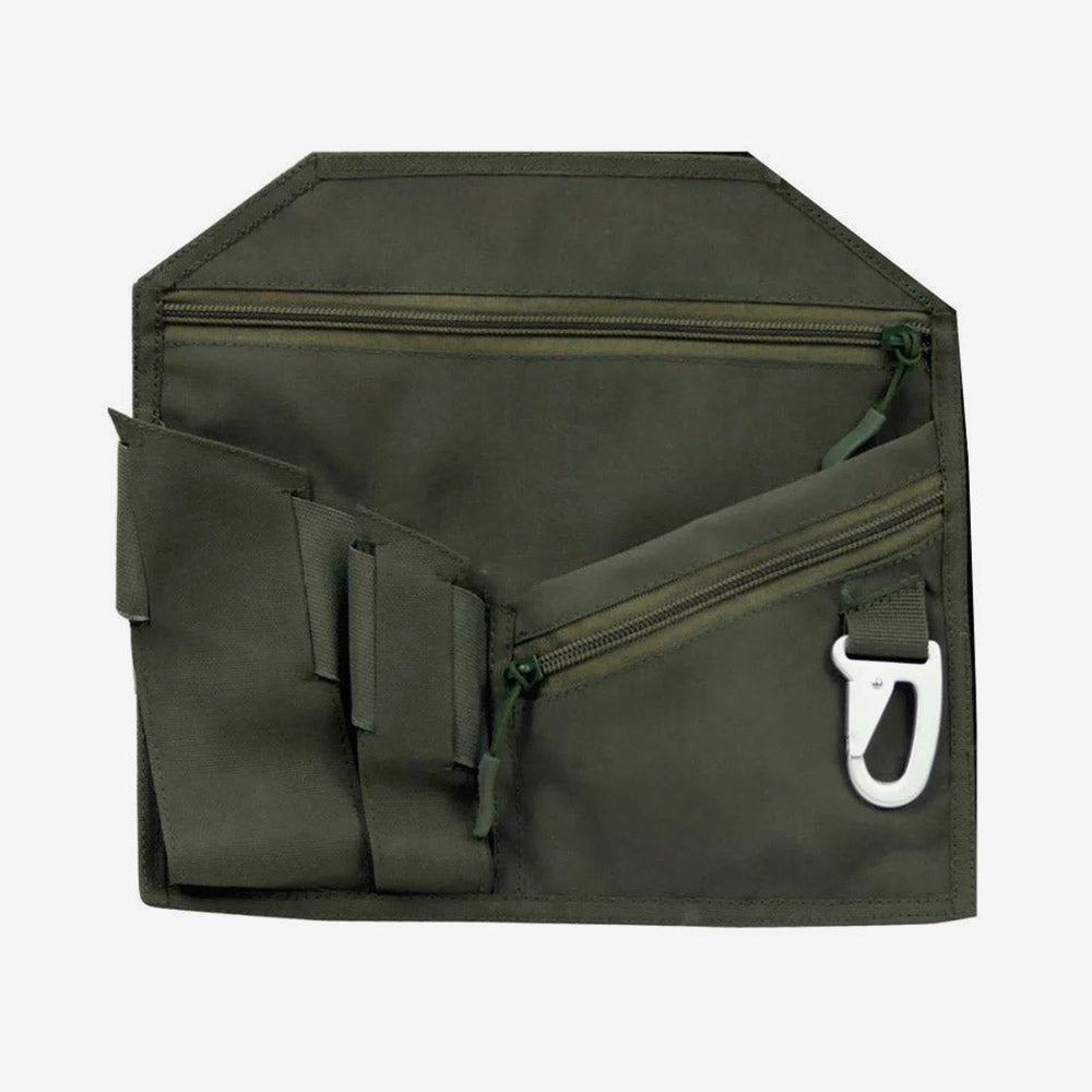 Er verfügt über zwei Reißverschlusstaschen zum Sichern wertvoller oder kleinerer Gegenstände sowie über Fächer für Stifte, Multitools, Taschenlampen, Überlebensausrüstung, Dokumente und Elektronik sowie einen mil-spec Metallschlüsselanhänger.